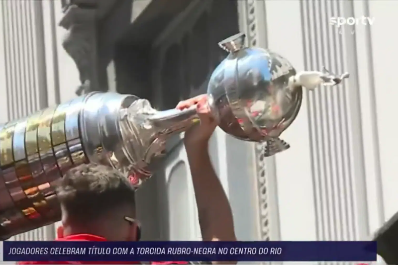 A comemoração do tetra da Libertadores do Flamengo, neste domingo (30), teve um detalhe curioso: o troféu de campeão chegou quebrado. A parte danificada foi a figura do jogador no topo da taça, que precisou ser improvisadamente consertada com fita adesiva, segundo o site “ge”. O estrago teria ocorrido ainda no gramado do Estádio Monumental de Lima, logo após a cerimônia de premiação.